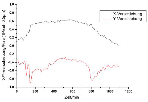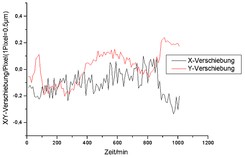 Die Verschiebungen in der Ebene (x-y) während der Messung zeigen