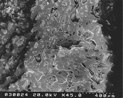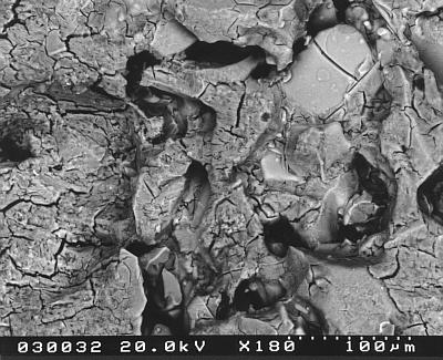 Die Kristalle im linken Bild sind nach dem Trocken völlig verschwunden. Das ist eigentlich nur damit zu erklären, dass nach dem Ausschleusen der noch gefrorenen Probe beim Transport in den Trockenschrank Kondensation der feuchten Laborluft auf der Oberfläche stattgefunden und das damit eingetragene flüssige Wasser eine Auflösung der Kristalle bewirkt hat. Oder aber bei der Dehydration fällt alles in sich zusammen (???)