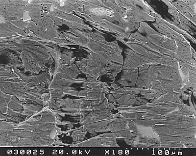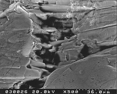 Im rechten Bild rechts unten könnte man eine Salzkruste diskutieren, die als feiner Faserfilz aufgewachsen ist. Das kann aber dann nur Kieserit sein. Leider ist mit der am REM verfügbaren EDX-Analyse eine Bestimmung der Hydratstufen nicht möglich.