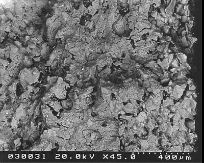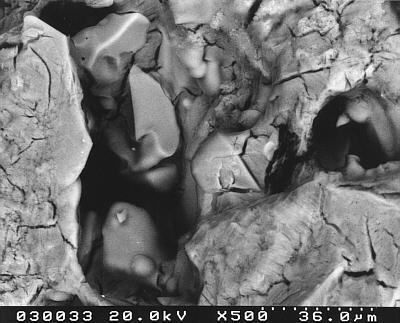 Die Probe wurde nicht weiter gebrochen, sondern es ist die Lösungssituation am vorher erstellen Querbruch dargestellt. In dieser Übersichtsaufnahme ist rechts im Bild die nach dem Salzsprengtest mit Salz verdichtete Oberflächenzone zu erkennen. Durch die Wasserbeaufschlagung ist das Salz gelöst worden. Auch unterhalb der verdichtetene Zone (links im Bild) ist der Porenraum (wie nicht anders zu erwarten) mit Lösung gefüllt. Man erkennt aber in diesem Bild bereits, dass sich offenbar Kristallstrukturen gebildet haben, die z.T. von der Oberfläche (rechts, wo ja Ausblühungen vorgelegen haben) radial über die verdichtete Zone wachsen.