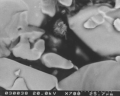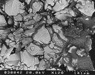 In einer Ausschnittsvergrößerung in der Nähe der Oberfläche ist der Übergangsbereich Oberfächen-Salz"kruste"/gefüllter Porenraum gezeigt. Hier liegen feine Kristalle und Porenlösung nebeneinander.