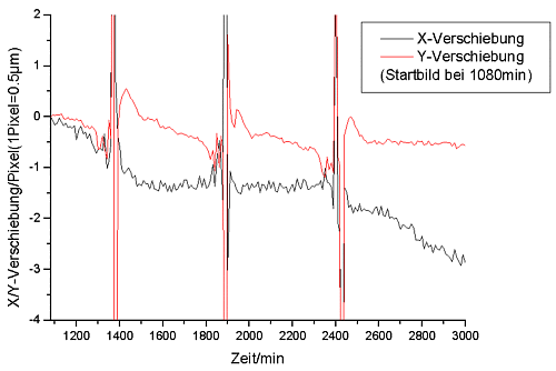 Die Verschiebungen in der Ebene (x-y) während der Messung zeigen