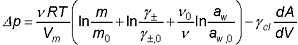 Es ist Δp der Kristallisationsdruck, ν die Anzahl der Ionen, die bei der Lösung des Salzes freigesetzt werden, R die Gaskonstante, T die Temperatur, und Vm das Molvolumen des Salzes. Weiterhin ist m die Molalität der Salzlösung im Porenraum, m0 die Sättigungsmolalität des nicht unter Druck stehenden Kristalls, γ± und γ±,0 sind die Aktivitätskoeffizienten bei den Konzentrationen m bzw. m0. Bei Hydratsalzen ist weiterhin der letzte Term im Klammerausdruck zu beachten. Hier sind aw bzw. aw,0 die Wasseraktivitäten bei den Konzentrationen m bzw. m0. Weiterhin ist ν0 die Anzahl der Hydratwassermoleküle, die bei der Dissoziation des Salzes freigesetzt werden.