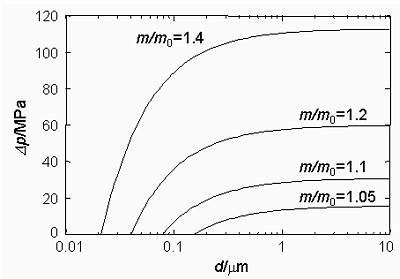 Der letzte Term der Gleichung beschreibt die Abhängigkeit des Kristallisationsdruckes von der Kristallgröße. Es sind A und V die Oberfläche und das Volumen des Kristalls, γcl ist die freie Oberflächenenergie der Grenzfläche Kristall/Lösung. Für einen würfelförmigen NaCl-Kristall ergeben sich für verschiedene Übersättigungen die in nebenstehender Abbildung dargestellten Abhängigkeiten des Kristallisationsdrucks von der Kantenlänge d des Würfels.