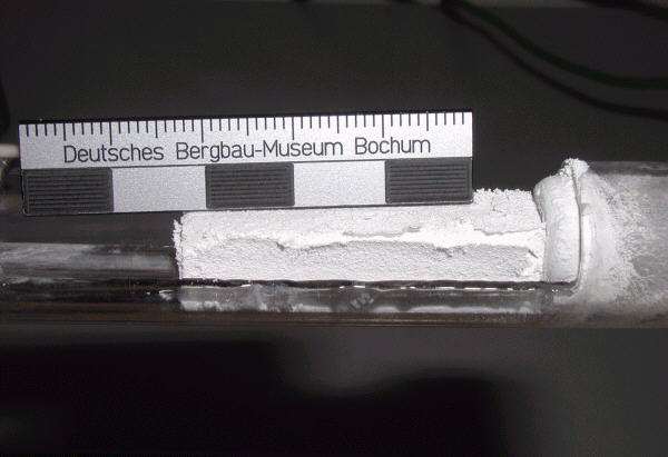 Die Notwendigkeit einer sehr sorgfältigen Betrachtung und Berücksichtigung der Randbedingungen während der Dilatometer-Messungen wurde bereits in den ersten Untersuchungen deutlich. Proben, die zu Versuchsbeginn mit 10 %igen Salzlösungen getränkt wurden und dann während der Messung an der Luft trockneten, zeigten hohe Dehnwerte. Genauere Begutachtungen erbrachten allerdings, dass es sich bei den gemessenen Längenänderungen nicht um eine ausschließliche Dehnung im Substratgefüge handelte, sondern hohe Dehnanteile durch Ausblühungen an der Substratoberfläche beigetragen wurden (krasses Beispiel siehe Abb. unten). Besonders kritisch sind die Ausblühungen an der Stirnfläche zur Anpressplatte zu sehen. Die hier frei aufwachsenden Salzkristalle erklären die extrem hohen Dehnwerte, die innerhalb des Substratmaterials kaum zu erwarten sind.