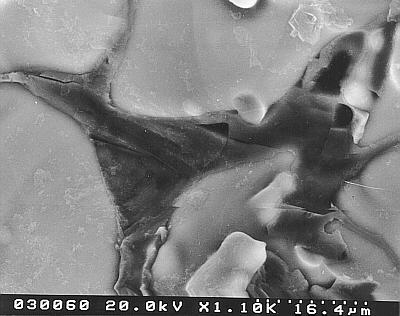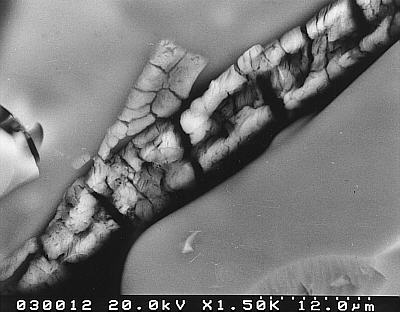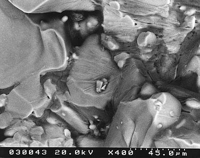 Dieser Schrumpfungsprozess geht weiter bis das gesamte Salz dehydratisiert ist. Im rechten Bild ist die Situation einer vergleichbaren Pore nach Austrocknung dargestellt. Der Habitus der ehemaligen Kristalle ist erhalten geblieben, aber von feinen Rissen durchsetzt.