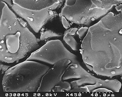 Im weiteren Verlauf der Trocknung dehydratisiert das Salz unter Volumenverringerung. Es entstehen Schrumpfungsrisse, die entlang der Kristallgrenzen verlaufen (linkes Bild). Man erkennt deutlich, wie die Salzkristalle gewachsen sind. Bei diesem Prozess schrumpft auch die gesamte Probe, was ebenfalls mit den Dilatometermessungen korreliert.